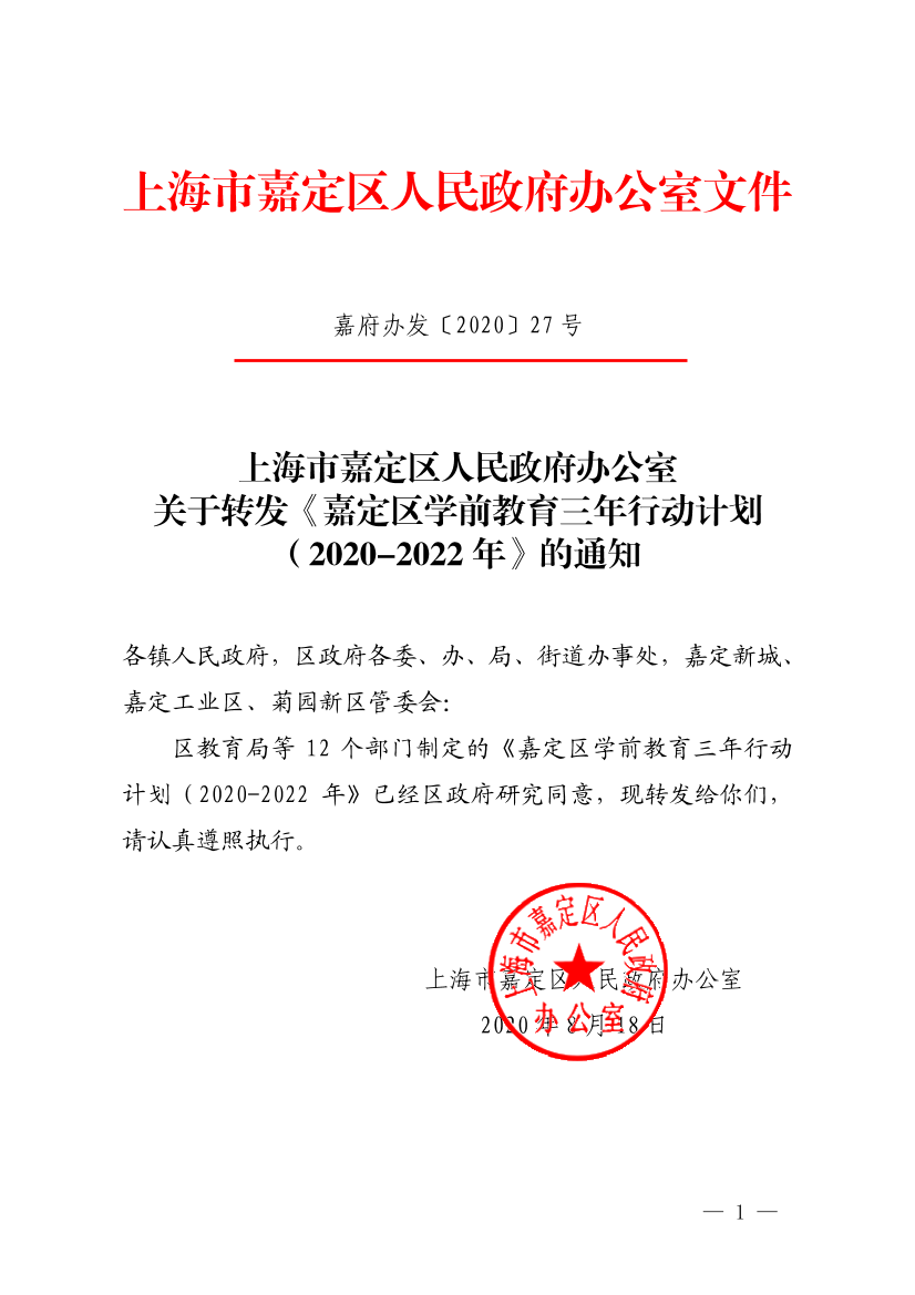上海市嘉定区人民政府办公室关于转发《嘉定区学前教育三年行动计划(2020-2022年》的通知