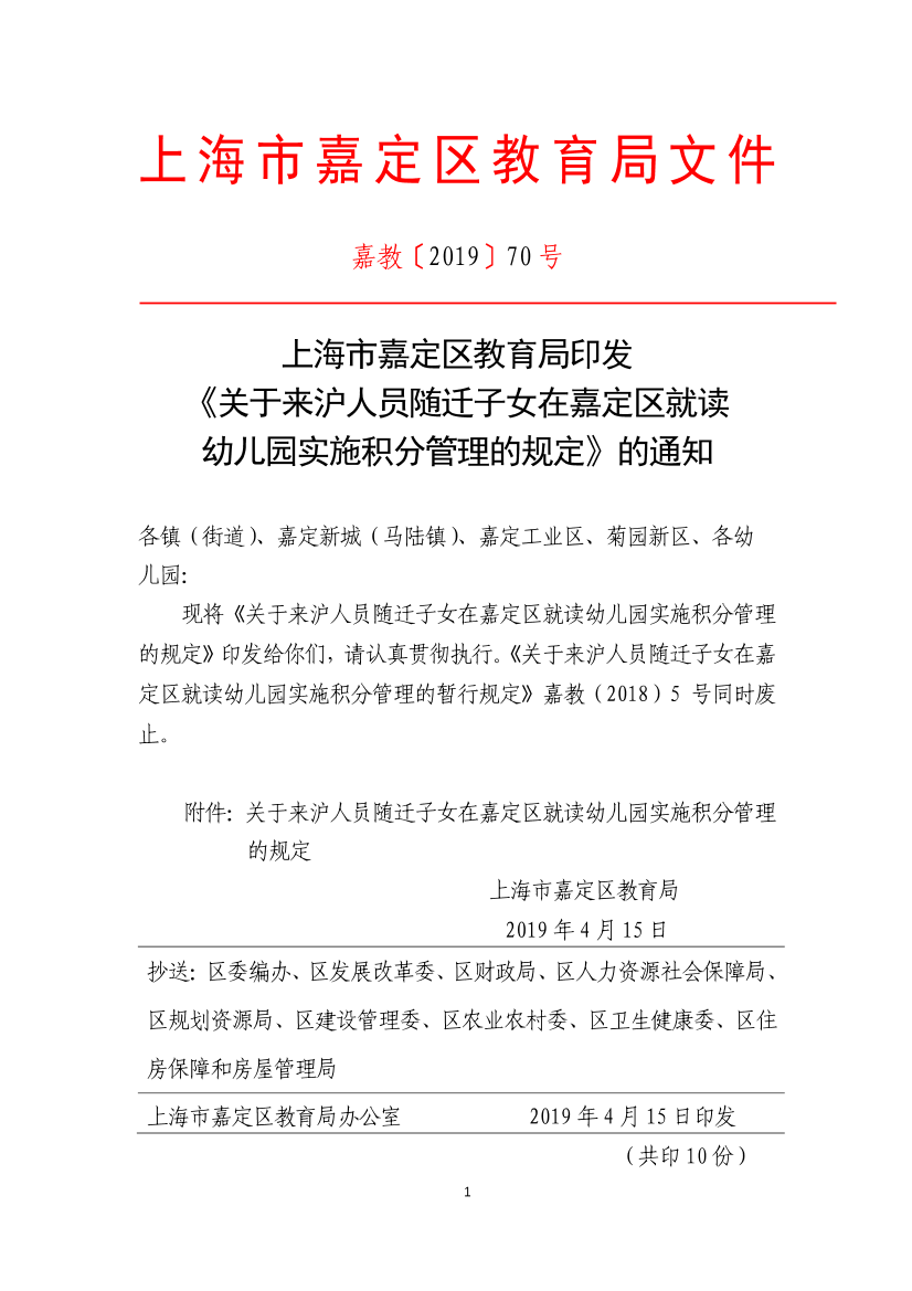 上海市嘉定区教育局印发《关于来沪人员随迁子女在嘉定区就读幼儿园实施积分管理的规定》的通知