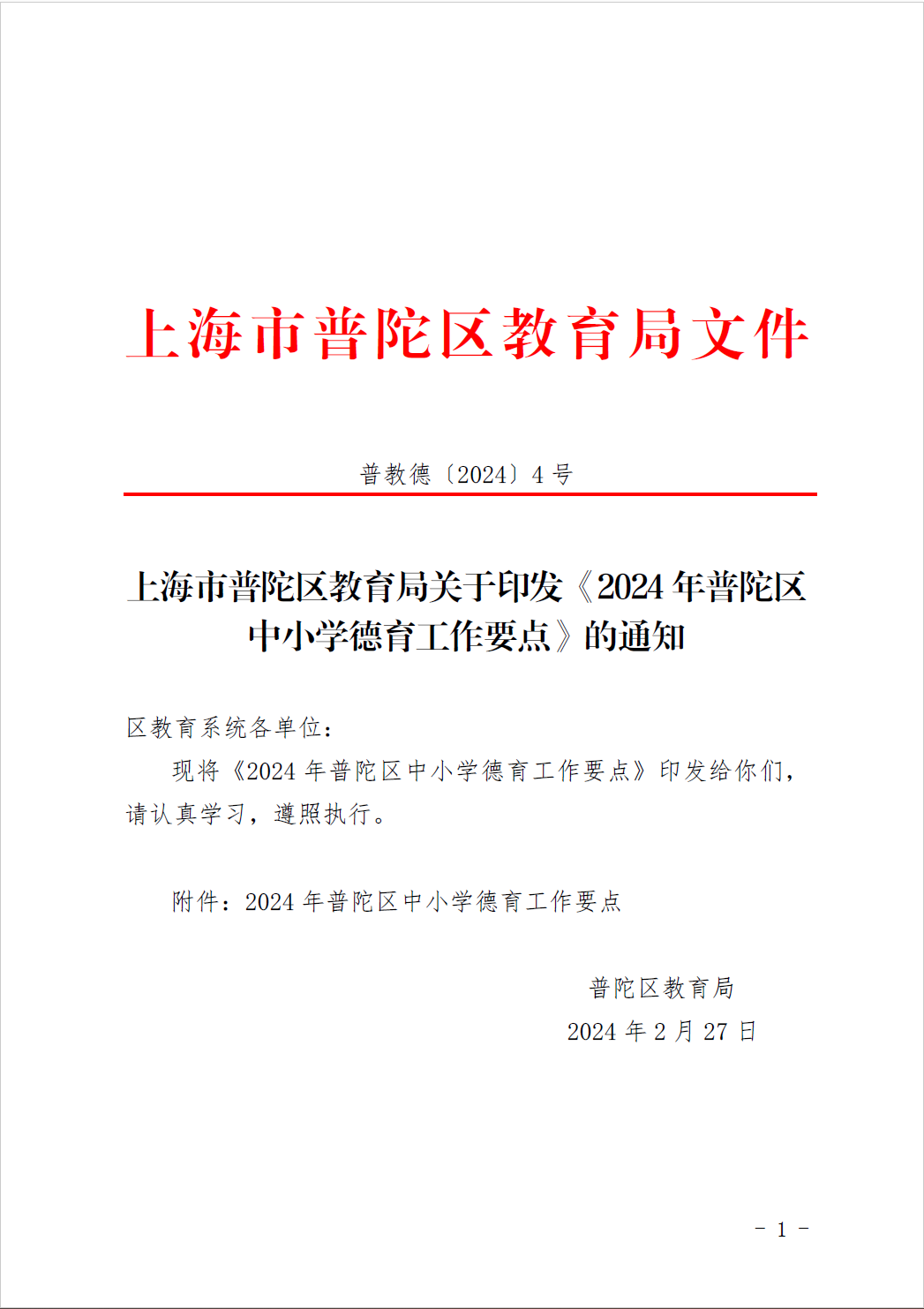 现将《2024年普陀区中小学德育工作要点》印发给你们,请认真学习,遵照执行。