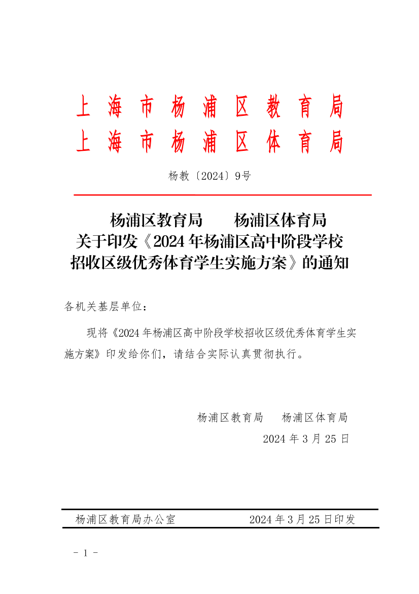 杨浦区教育局 杨浦区体育局关于印发《2024年杨浦区高中阶段学校招收区级优秀体育学生实施方案》的通知