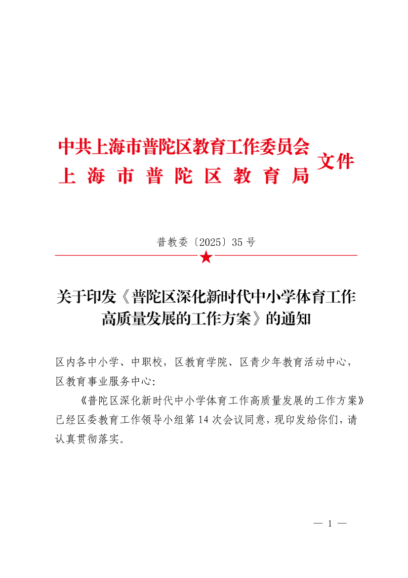普陀区深化新时代中小学体育工作高质量发展的工作方案