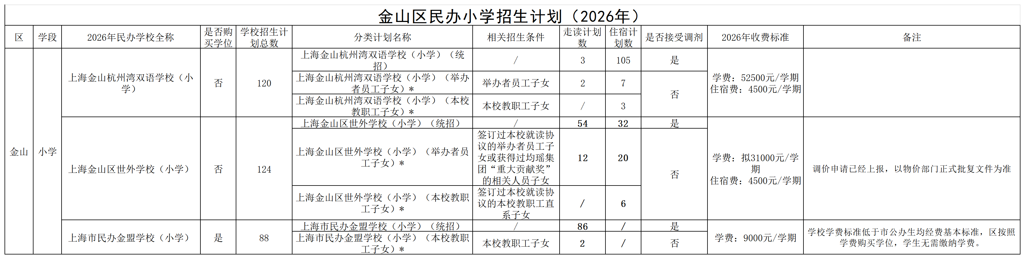 2026年金山区民办学校招生分类计划及学费情况