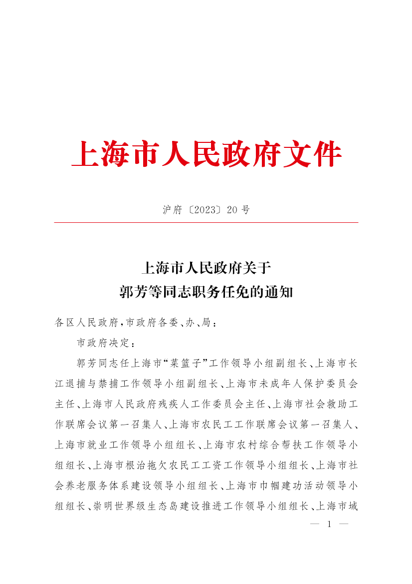 郭芳同志任上海市“菜篮子”工作领导小组副组长、上海市长江退捕与禁捕工作领导小组副组长、上海市未成年人保护委员会主任、上海市人民政府残疾人工作委员会主任、上海市社会救助工作联席会议第一召集人、上海市农民工工作联席会议第一召集人、上海市就业工作领导小组组长、上海市农村综合帮扶工作领导小组组长、上海市根治拖欠农民工工资工作领导小组组长、上海市社会养老服务体系建设领导小组组长、上海市巾帼建功活动领导小组组长、崇明世界级生态岛建设推进工作领导小组组长、上海市域外农场工作领导小组组长;