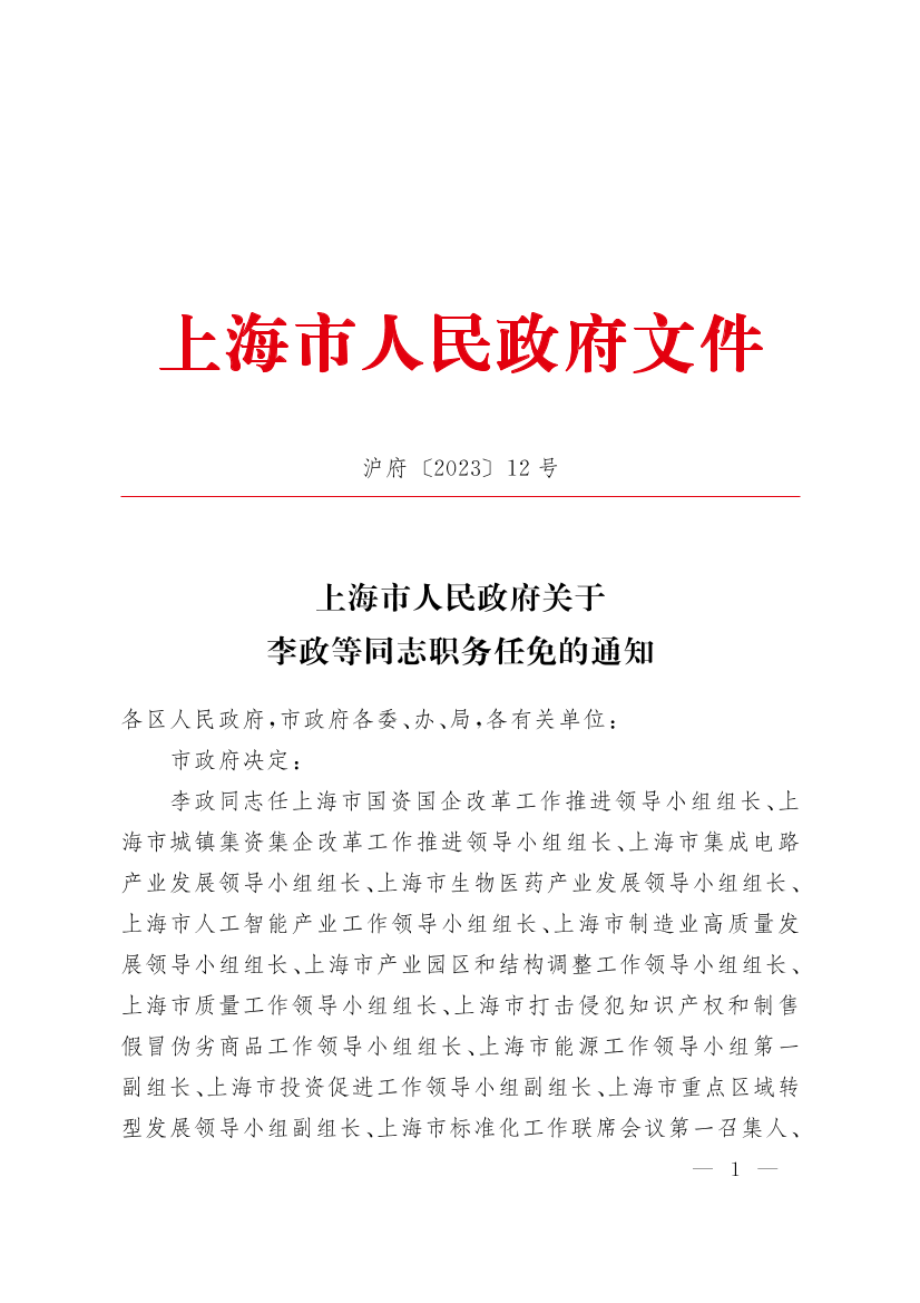 李政同志任上海市国资国企改革工作推进领导小组组长、上海市城镇集资集企改革工作推进领导小组组长、上海市集成电路产业发展领导小组组长、上海市生物医药产业发展领导小组组长、上海市人工智能产业工作领导小组组长、上海市制造业高质量发展领导小组组长、上海市产业园区和结构调整工作领导小组组长、上海市质量工作领导小组组长、上海市打击侵犯知识产权和制售假冒伪劣商品工作领导小组组长、上海市能源工作领导小组第一副组长、上海市投资促进工作领导小组副组长、上海市重点区域转型发展领导小组副组长、上海市标准化工作联席会议第一召集人、上海市特种设备安全工作联席会议第一召集人、上海市服务企业联席会议召集人、上海市食品药品安全委员会主任、上海市反垄断和公平竞争委员会主任、上海市政府质量奖审定委员会主任委员。