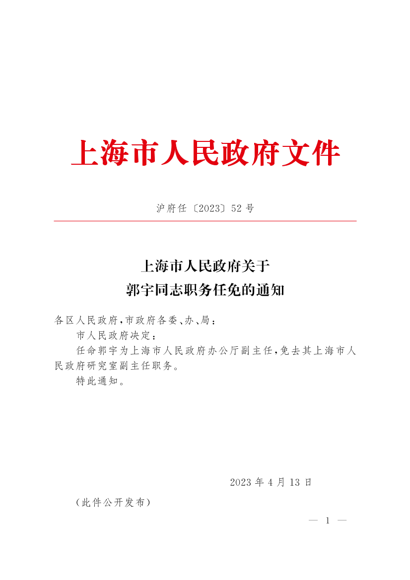 任命郭宇为上海市人民政府办公厅副主任,免去其上海市人民政府研究室副主任职务。