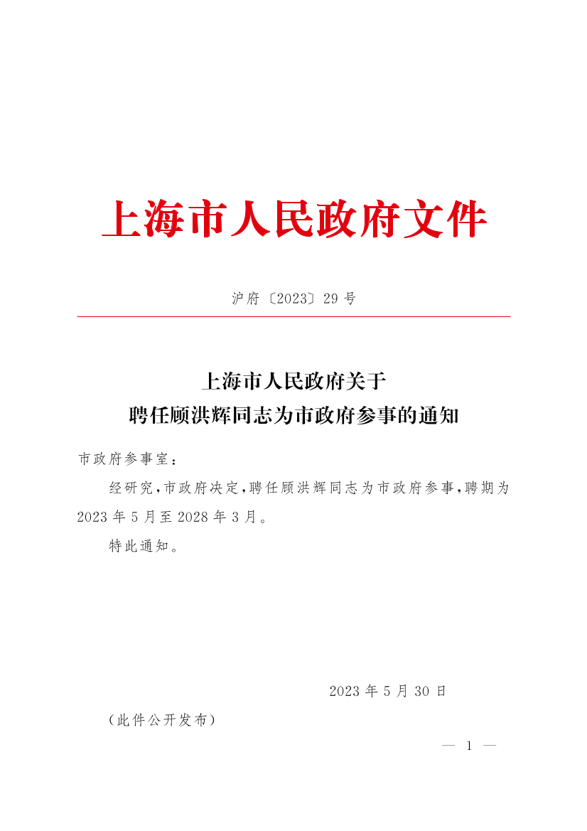 经研究,市政府决定,聘任顾洪辉同志为市政府参事,聘期为2023年5月至2028年3月。