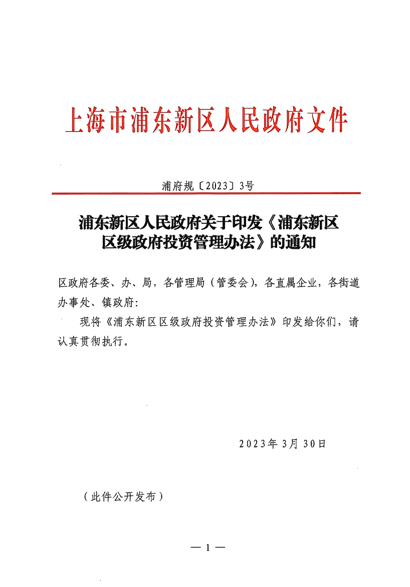 浦东新区人民政府关于印发《浦东新区区级政府投资管理办法》的通知