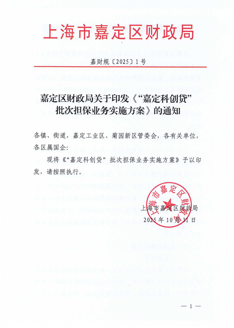 现将《“嘉定科创贷”批次担保业务实施方案》予以印发,请按照执行。