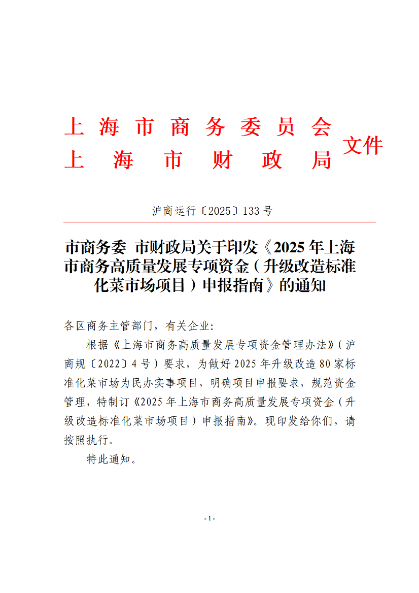 为进一步贯彻落实《中共上海市委办公厅 上海市人民政府办公厅印发〈2025年上海市为民办实事项目〉的通知》(沪委办〔2025〕3号)《市商务委关于印发〈2025年上海市标准化菜市场升级改造工作方案〉的通知》(沪商运行〔2025〕19号)的有关要求,有序推进我市标准化菜市场升级改造,根据《上海市商务高质量发展专项资金管理办法》(沪商规〔2022〕4号)制定本申报指南。