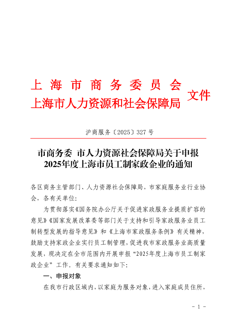 为贯彻落实《国务院办公厅关于促进家政服务业提质扩容的意见》《国家发展改革委等部门关于支持和引导家政服务业员工制转型发展的指导意见》和《上海市家政服务条例》有关精神,鼓励支持家政企业实行员工制管理,促进我市家政服务业高质量发展,现决定在全市范围内开展申报“2025年度上海市员工制家政企业”工作。有关要求通知如下: