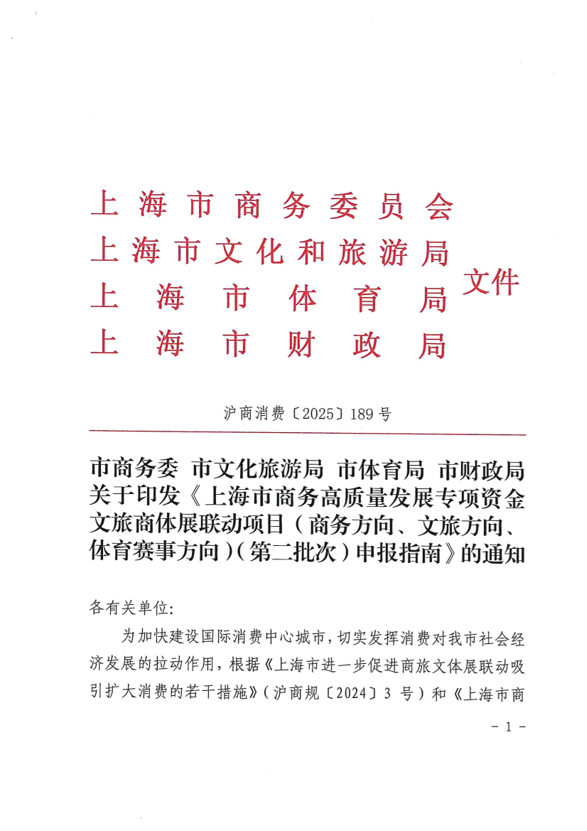 为加快建设国际消费中心城市,切实发挥消费对我市社会经济发展的拉动作用,根据《上海市进一步促进商旅文体展联动吸引扩大消费的若干措施》(沪商规〔2024〕3号)和《上海市商务高质量发展专项资金管理办法》(沪商规〔2022〕4号)等文件精神,现将《上海市商务高质量发展专项资金文旅商体展联动项目(商务方向、文旅方向、体育赛事方向)(第二批次)申报指南》印发给你们,请按照要求做好相关申报工作。