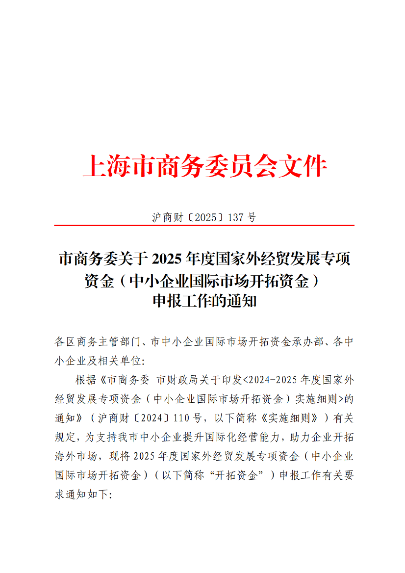 根据《市商务委 市财政局关于印发<2024-2025年度国家外经贸发展专项资金(中小企业国际市场开拓资金)实施细则>的通知》(沪商财〔2024〕110号,以下简称《实施细则》)有关规定,为支持我市中小企业提升国际化经营能力,助力企业开拓海外市场,现将2025年度国家外经贸发展专项资金(中小企业国际市场开拓资金)(以下简称“开拓资金”)申报工作有关要求通知如下: