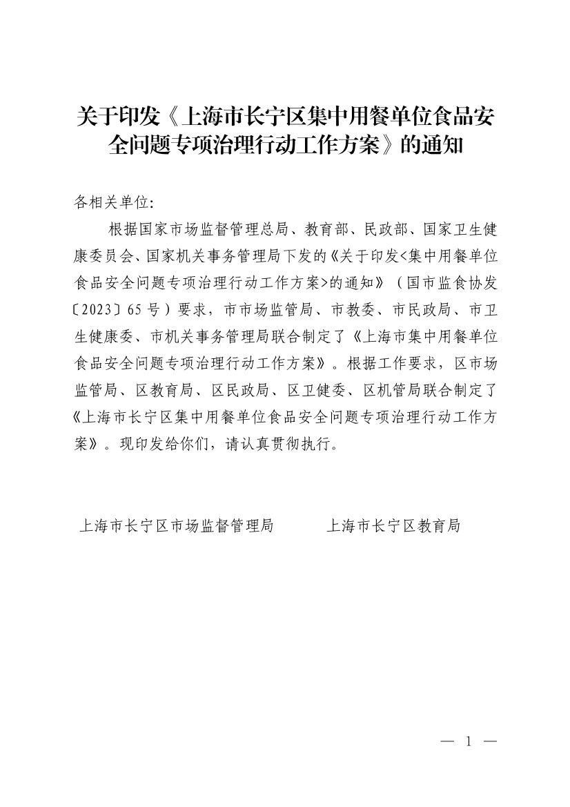 根据国家市场监督管理总局、教育部、民政部、国家卫生健康委员会、国家机关事务管理局下发的《关于印发<集中用餐单位食品安全问题专项治理行动工作方案>的通知》(国市监食协发〔2023〕65号)要求,市市场监管局、市教委、市民政局、市卫生健康委、市机关事务管理局联合制定了《上海市集中用餐单位食品安全问题专项治理行动工作方案》。根据工作要求,区市场监管局、区教育局、区民政局、区卫健委、区机管局联合制定了《上海市长宁区集中用餐单位食品安全问题专项治理行动工作方案》。现印发给你们,请认真贯彻执行。