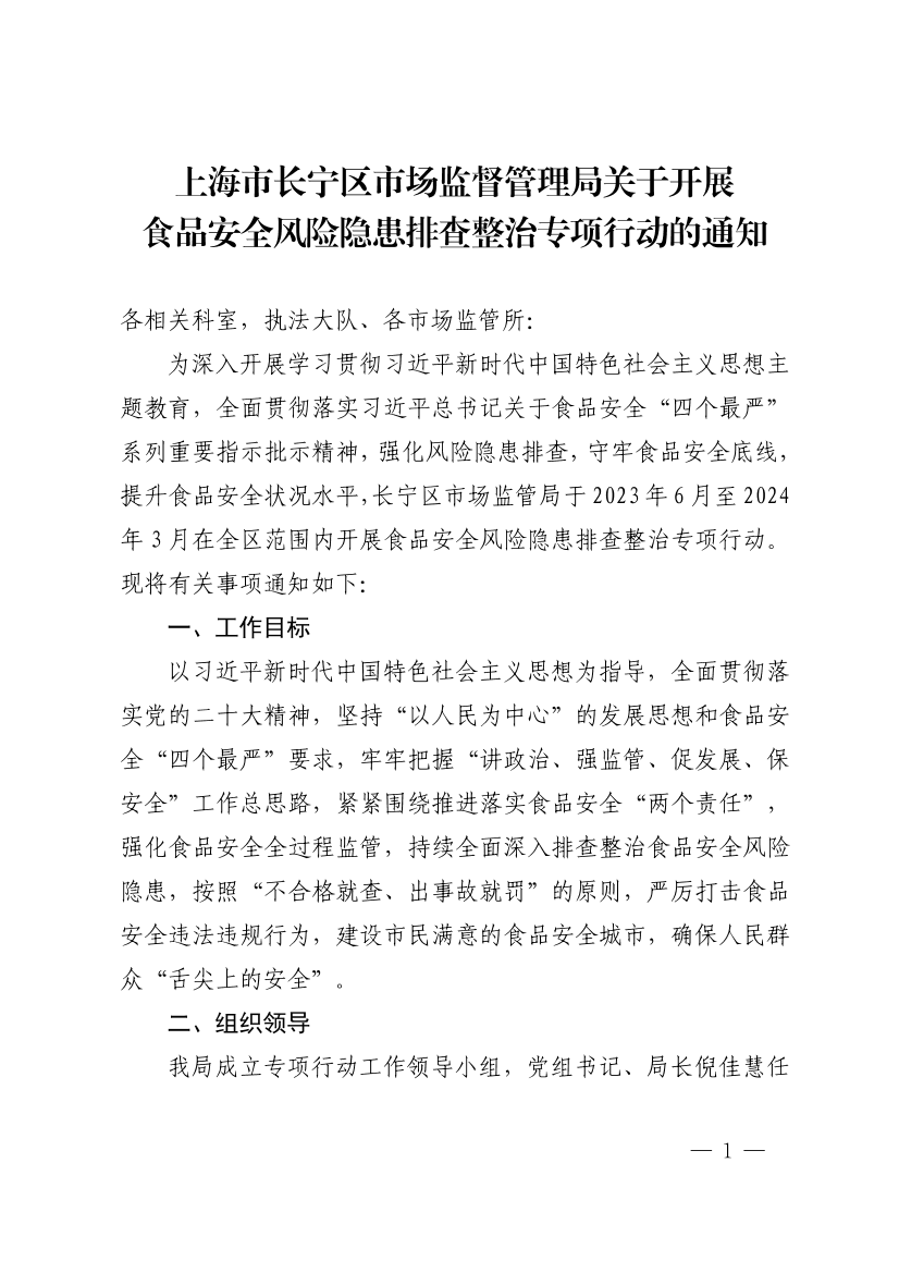 为深入开展学习贯彻习近平新时代中国特色社会主义思想主题教育,全面贯彻落实习近平总书记关于食品安全“四个最严”系列重要指示批示精神,强化风险隐患排查,守牢食品安全底线,提升食品安全状况水平,长宁区市场监管局于2023年6月至2024年3月在全区范围内开展食品安全风险隐患排查整治专项行动。现将有关事项通知如下:
