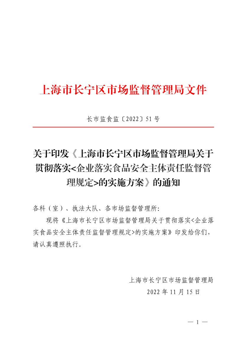 上海市长宁区市场监督管理局关于贯彻落实《企业落实食品安全主体责任监督管理规定》的实施方案