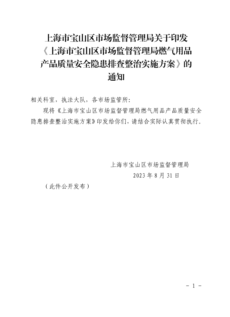 上海市宝山区市场监督管理局燃气用品产品质量安全隐患排查整治实施方案