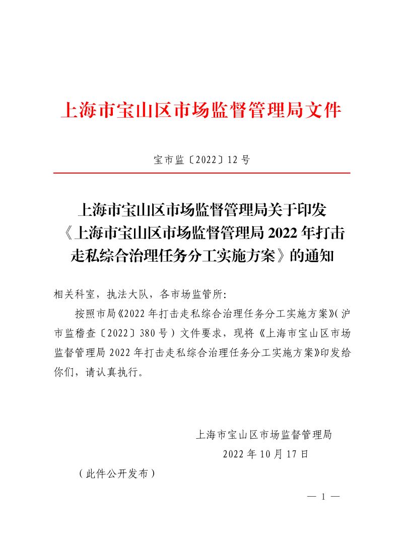 上海市宝山区市场监督管理局2022年打击走私综合治理任务分工实施方案