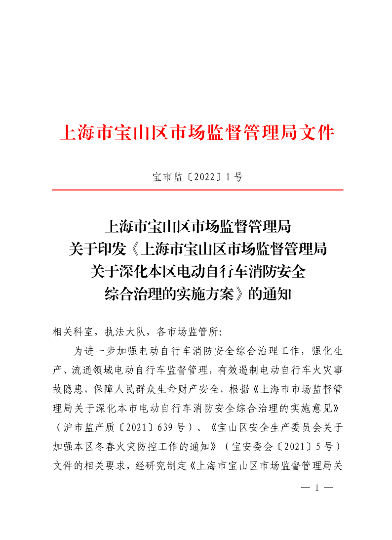 上海市宝山区市场监督管理局关于深化本区电动自行车消防安全综合治理的实施方案