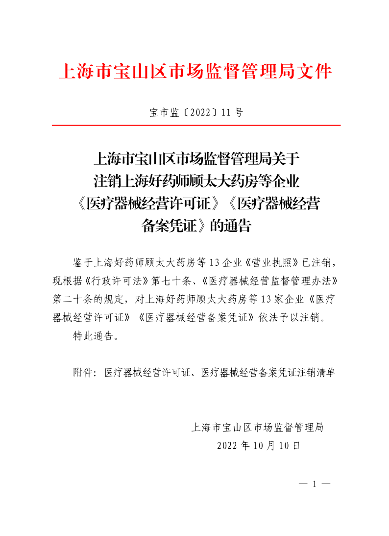 鉴于上海好药师顾太大药房等13企业《营业执照》已注销,现根据《行政许可法》第七十条、《医疗器械经营监督管理办法》第二十条的规定,对上海好药师顾太大药房等13家企业《医疗器械经营许可证》、《医疗器械经营备案凭证》依法予以注销。