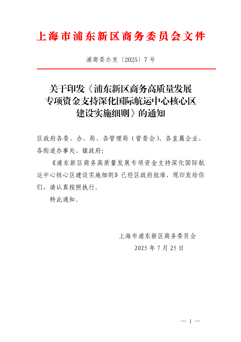 浦东新区商务高质量发展专项资金支持深化国际航运中心核心区建设实施细则