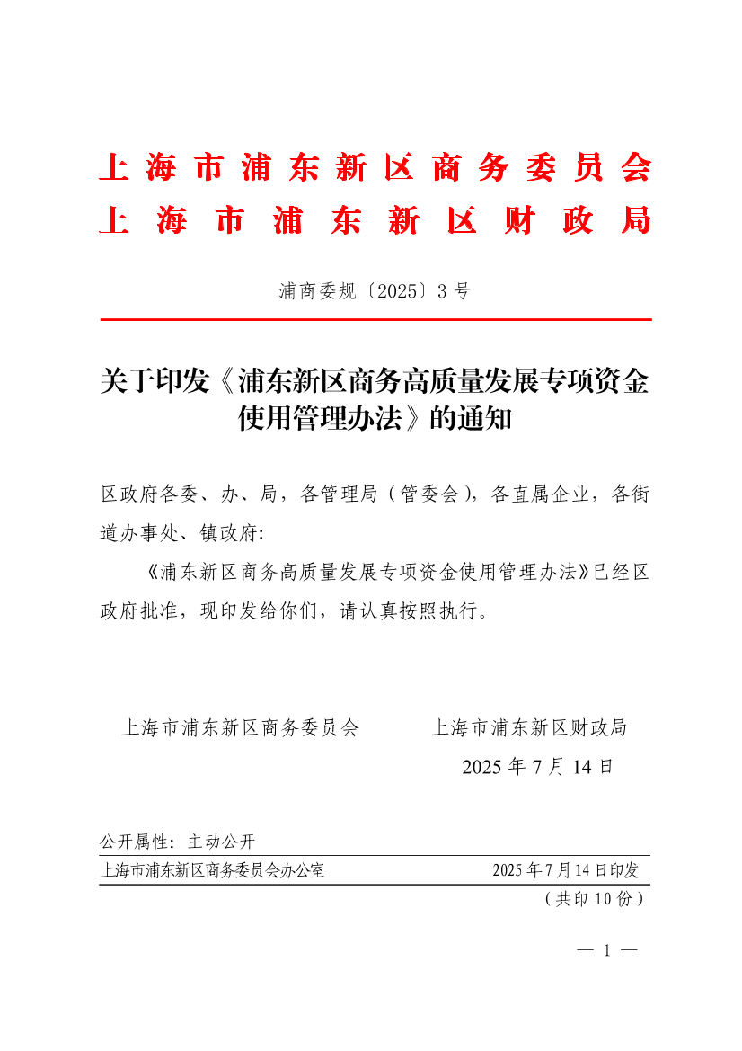 浦东新区商务高质量发展专项资金使用管理办法