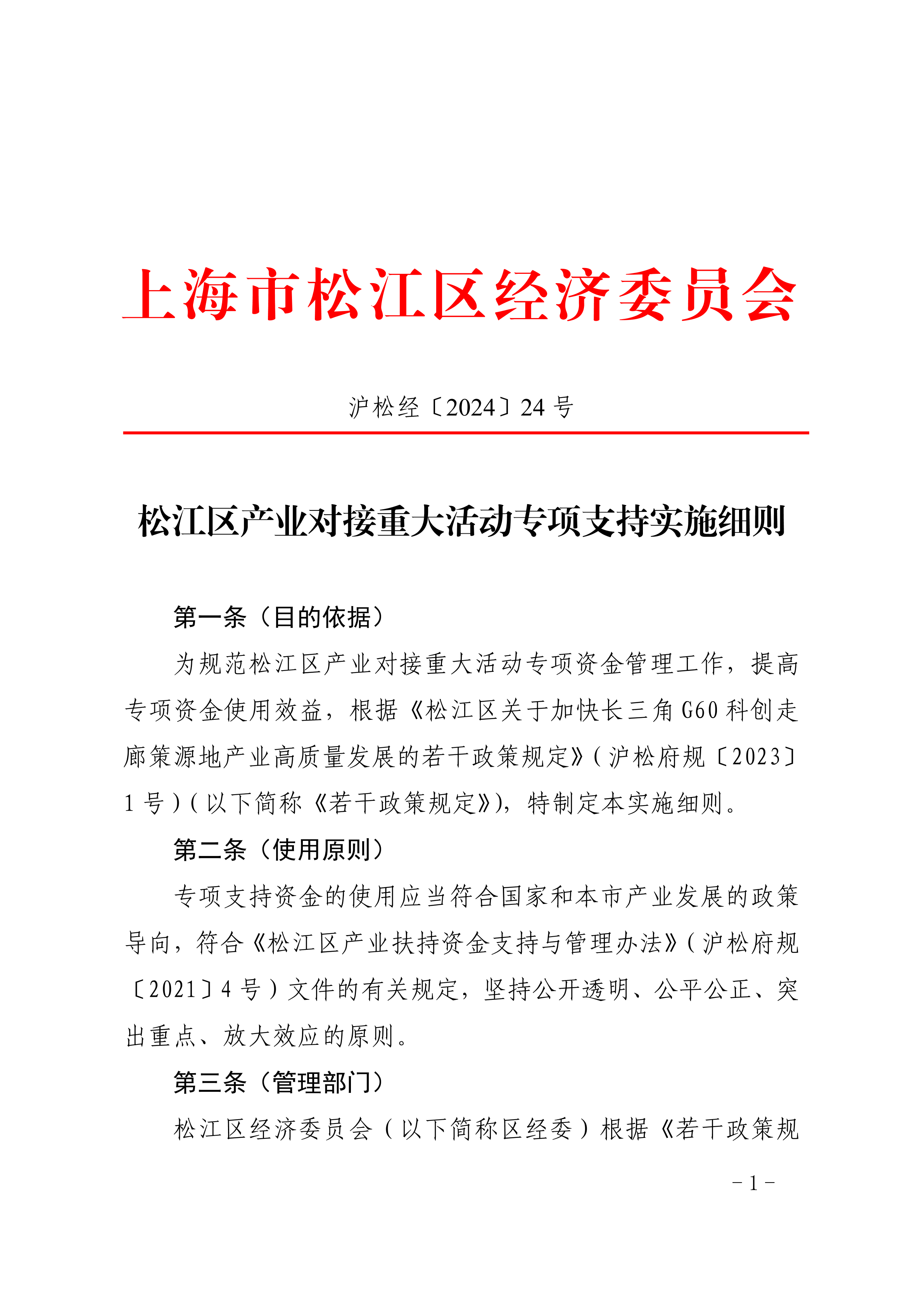 为规范松江区产业对接重大活动专项资金管理工作,提高专项资金使用效益,根据《松江区关于加快长三角G60科创走廊策源地产业高质量发展的若干政策规定》(沪松府规〔2023〕1号)(以下简称《若干政策规定》),特制定本实施细则。