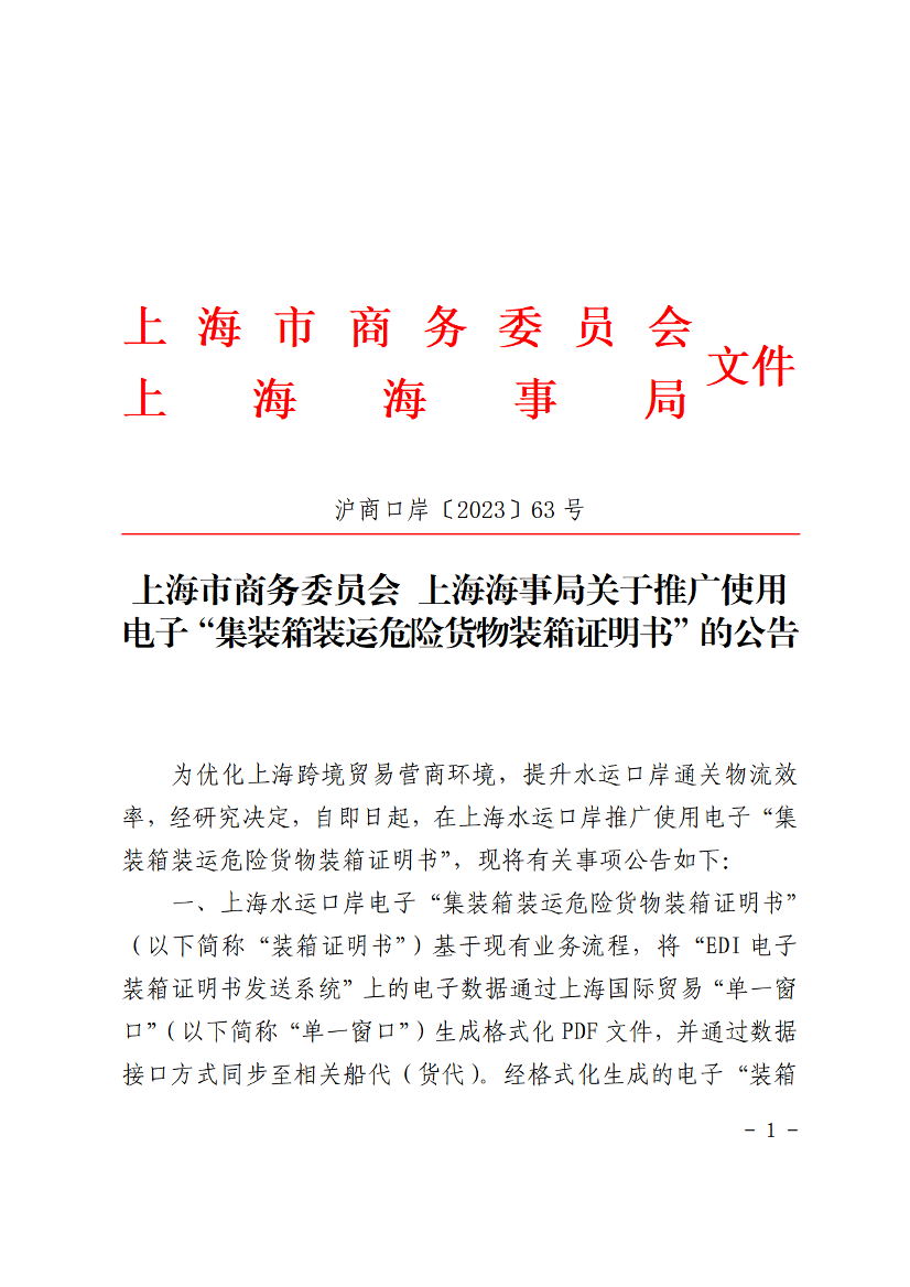 为优化上海跨境贸易营商环境,提升水运口岸通关物流效率,经研究决定,自即日起,在上海水运口岸推广使用电子“集装箱装运危险货物装箱证明书”,现将有关事项公告如下: