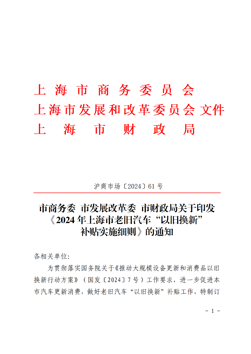 为贯彻落实国务院关于《推动大规模设备更新和消费品以旧换新行动方案》(国发〔2024〕7号)工作要求,进一步促进本市汽车更新消费,做好老旧汽车“以旧换新”补贴工作,特制订《2024年上海市老旧汽车“以旧换新”补贴实施细则》,现予印发,请遵照执行。