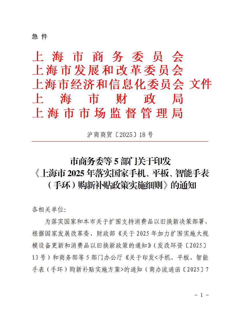 为落实国家和本市关于扩围支持消费品以旧换新决策部署,根据国家发展改革委、财政部《关于2025年加力扩围实施大规模设备更新和消费品以旧换新政策的通知》(发改环资〔2025〕13号)和商务部等5部门办公厅《关于印发<手机、平板、智能手表(手环)购新补贴实施方案>的通知(商办流通函〔2025〕7号)要求,现印发《上海市2025年落实国家手机、平板、智能手表(手环)购新补贴政策实施细则》,请认真贯彻执行。