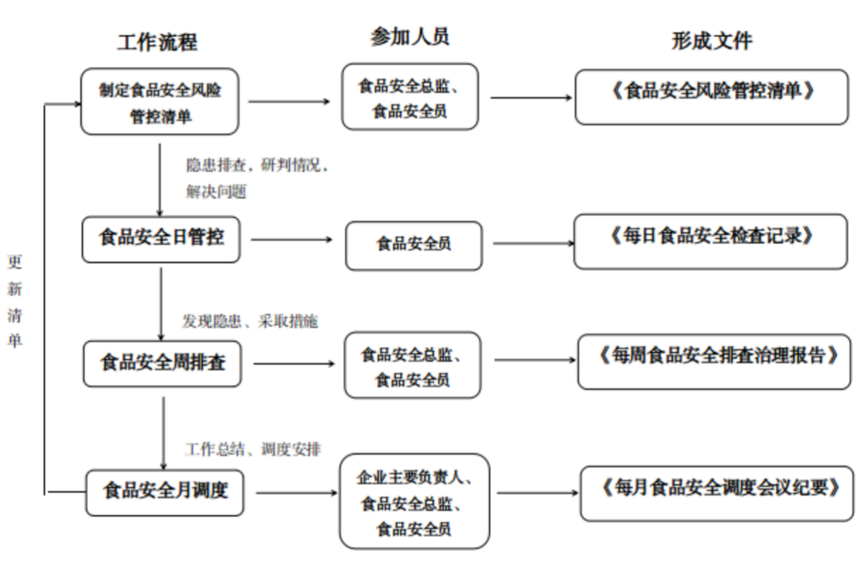 (四)食品安全总监、食品安全员等食品安全管理人员依据本企业的食品安全日管控、周排查、月调度工作程序(示例见附件2)开展风险管控工作。