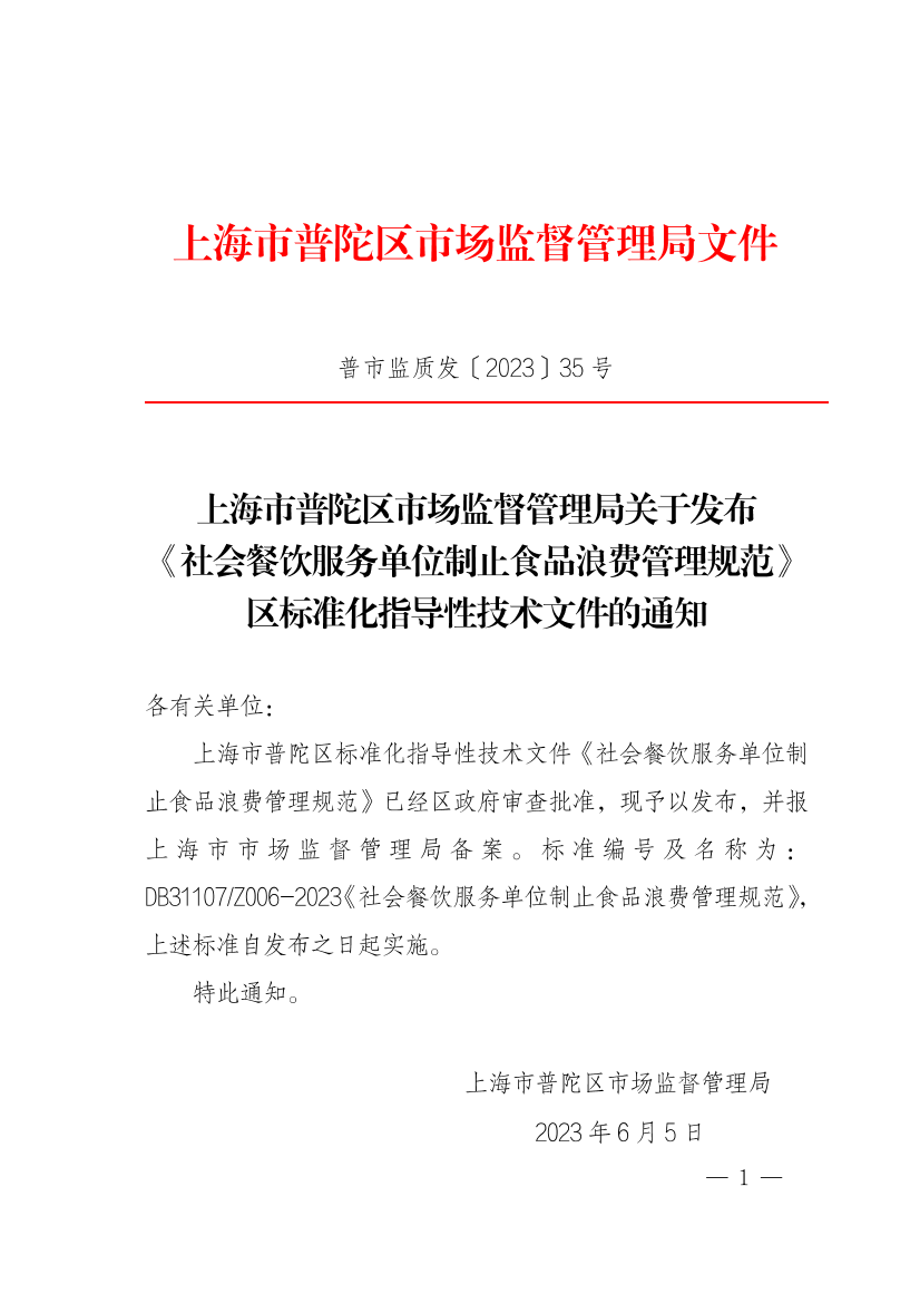上海市普陀区标准化指导性技术文件《社会餐饮服务单位制止食品浪费管理规范》已经区政府审查批准,现予以发布,并报上海市市场监督管理局备案。标准编号及名称为:DB31107/Z006-2023《社会餐饮服务单位制止食品浪费管理规范》,上述标准自发布之日起实施。