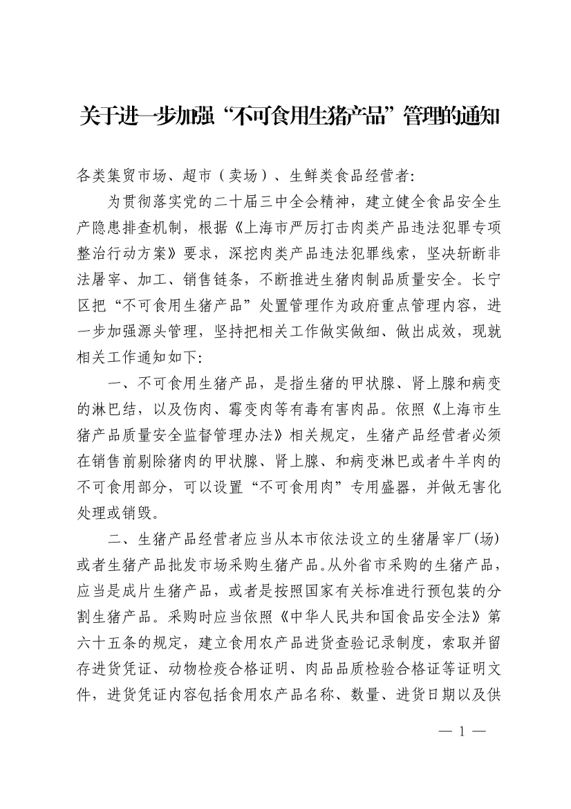 为贯彻落实党的二十届三中全会精神,建立健全食品安全生产隐患排查机制,根据《上海市严厉打击肉类产品违法犯罪专项整治行动方案》要求,深挖肉类产品违法犯罪线索,坚决斩断非法屠宰、加工、销售链条,不断推进生猪肉制品质量安全。长宁区把“不可食用生猪产品”处置管理作为政府重点管理内容,进一步加强源头管理,坚持把相关工作做实做细、做出成效,现就相关工作通知如下: