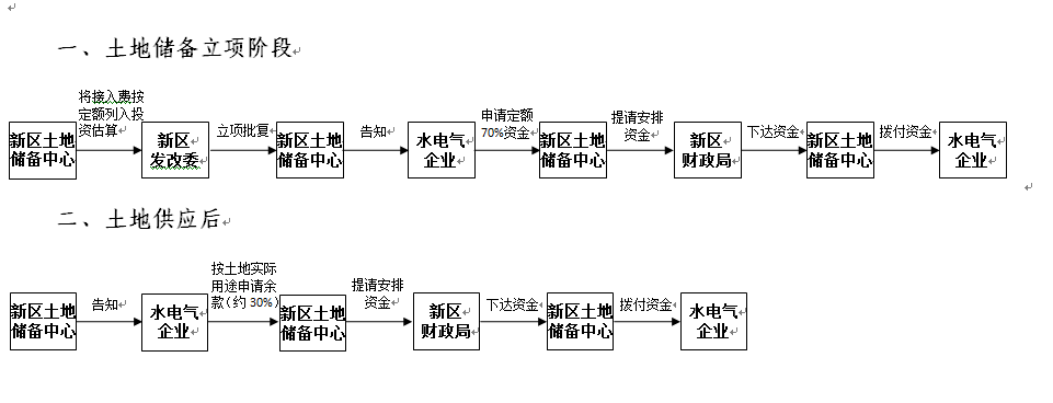( 一)土地储备项目批复后,新区土储中心告知水电气企业,由水电气企业向其提出接入工程费用资金申请,新区土储中心依据企业申请(并附发票),向新区财政局提出用款申请,待资金下达后,由新区土储中心将接入工程费用按定额估算的 70% 资金及时拨付至水电气企业专户。