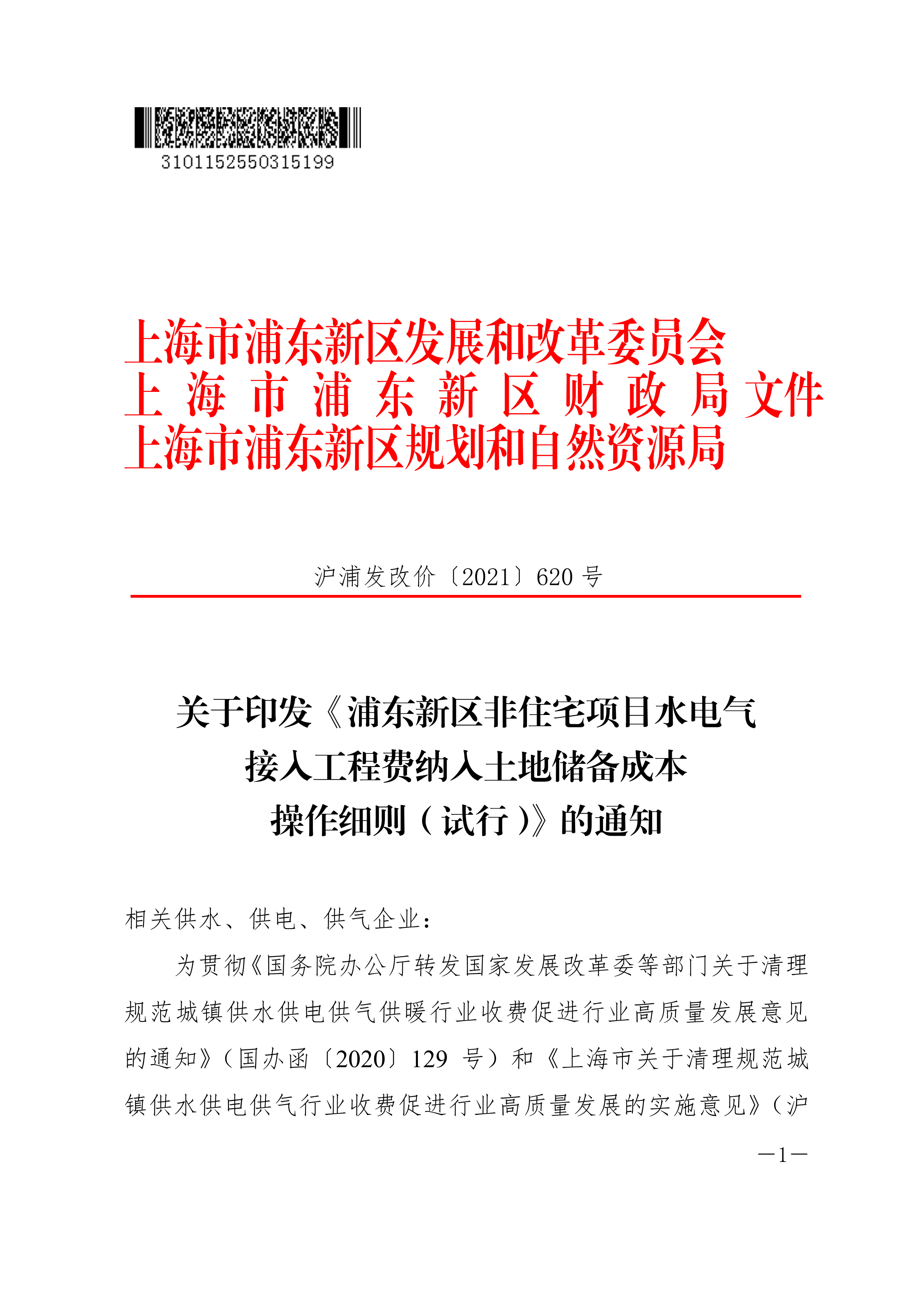 为贯彻《国务院办公厅转发国家发展改革委等部门关于清理规范城镇供水供电供气供暖行业收费促进行业高质量发展意见的通知》(国办函〔 2020 〕 129 号)和《上海市关于清理规范城镇供水供电供气行业收费促进行业高质量发展的实施意见》(沪府办〔 2021 〕 43 号)的要求,根据《关于印发 < 本市非住宅项目水电气接入工程费纳入土地储备成本操作办法(试行) > 的通知》(沪发改价管〔 2021 〕 28 号)等, 结合新区实际情况,我们制定了《浦东新区非住宅项目水电气接入工程费纳入土地储备成本操作细则(试行)》,经区政府同意,现予以印发,请遵照执行。