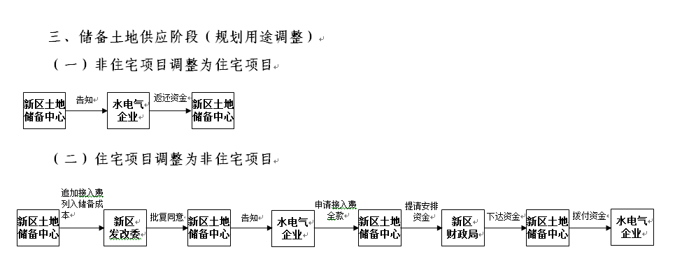 若土地供应阶段,储备土地规划用途由非住宅项目调整为住宅项目,新区土储中心应告知水电气企业,并要求其将已拨付的水电气接入工程费按原途径返还新区土储中心。反之则应由新区土储中心向新区发改委申请将接入工程费按定额标准追加列入土地储备成本,在土地供应完成后按第五条第(二)款流程足额拨付至水电气企业。资金退回和追加需按规定程序办理。