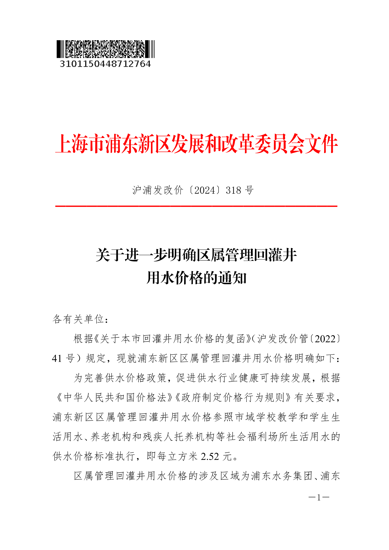 为完善供水价格政策,促进供水行业健康可持续发展,根据《中华人民共和国价格法》《政府制定价格行为规则》有关要求,浦东新区区属管理回灌井用水价格参照市域学校教学和学生生活用水、养老机构和残疾人托养机构等社会福利场所生活用水的供水价格标准执行,即每立方米2.52元。