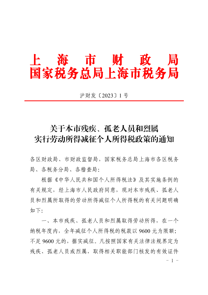 一、本市残疾、孤老人员和烈属取得劳动所得,在一个纳税年度内,全年减征个人所得税的税款以9600元为限额;不足9600元的,据实减征。凡按照国家有关法律法规界定为残疾、孤老人员或烈属,取得相关职能部门核发的有效证件或证明的个人均可享受上述优惠政策。