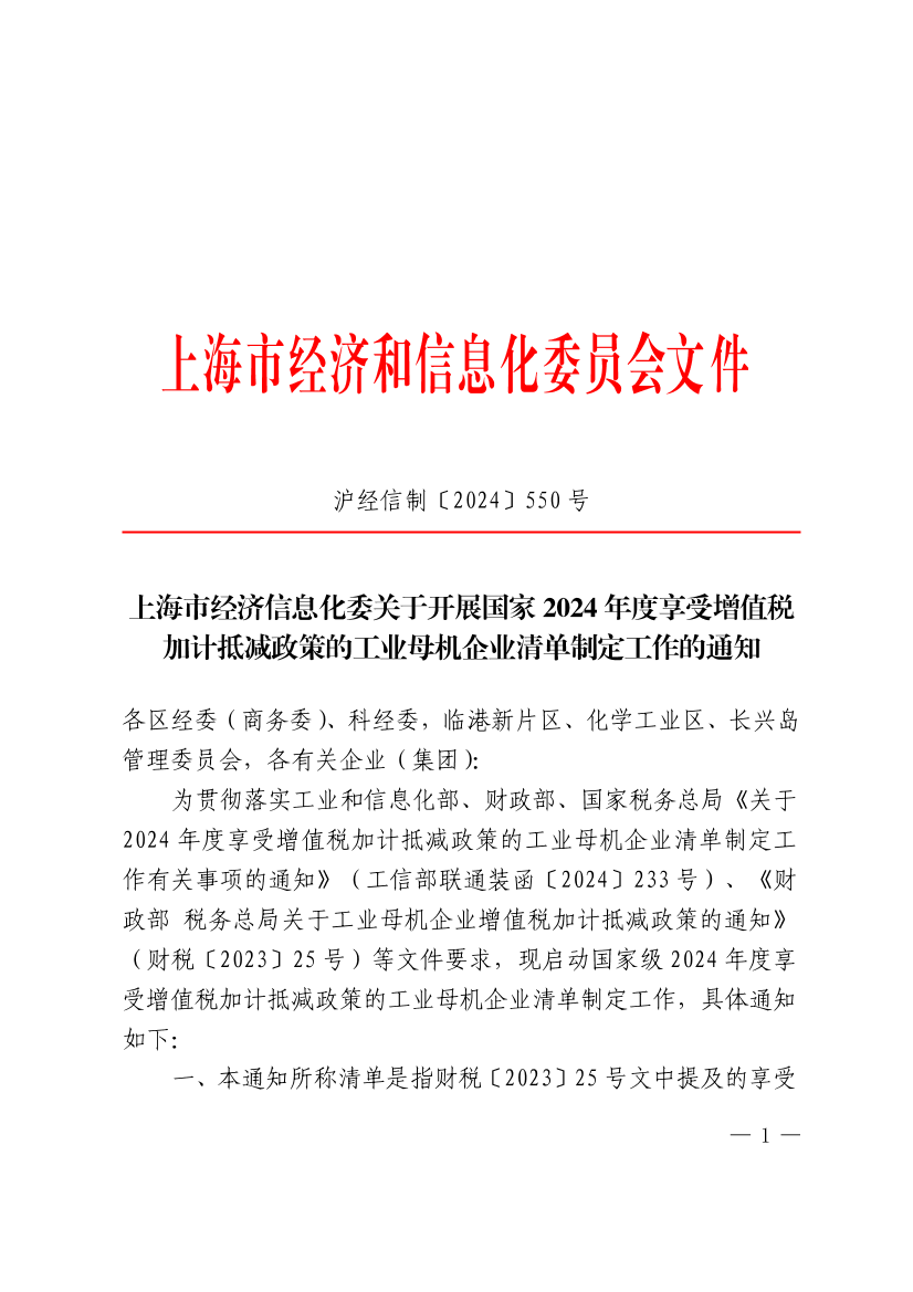 为贯彻落实工业和信息化部、财政部、国家税务总局《关于2024年度享受增值税加计抵减政策的工业母机企业清单制定工作有关事项的通知》(工信部联通装函〔2024〕233号)、《财政部 税务总局关于工业母机企业增值税加计抵减政策的通知》(财税〔2023〕25号)等文件要求,现启动国家级2024年度享受增值税加计抵减政策的工业母机企业清单制定工作,具体通知如下: