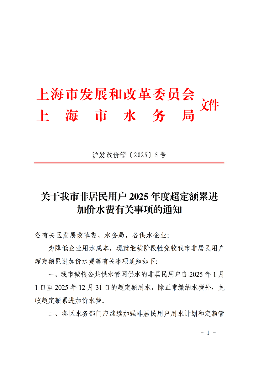 一、我市城镇公共供水管网供水的非居民用户自2025年1月1日至2025年12月31日的超定额用水,除正常缴纳水费外,免收超定额累进加价水费。