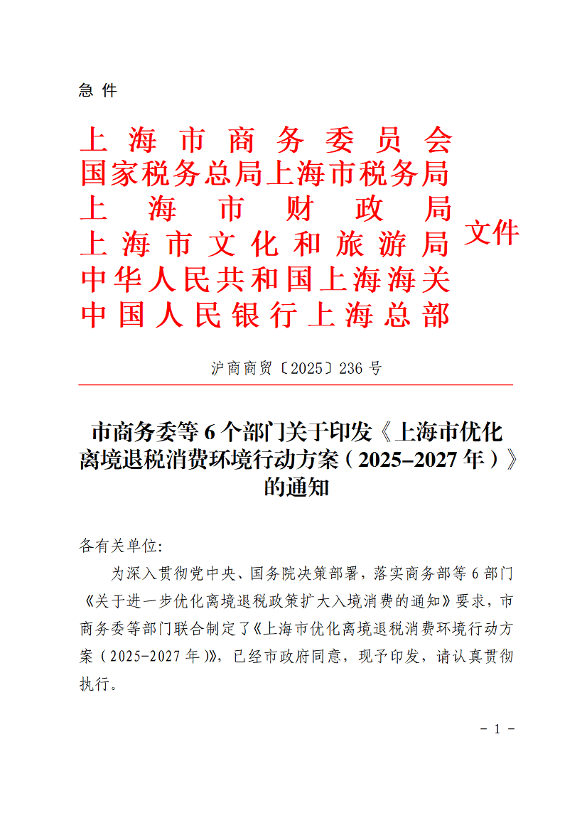 为深入贯彻党中央、国务院决策部署,落实商务部等6部门《关于进一步优化离境退税政策扩大入境消费的通知》要求,市商务委等部门联合制定了《上海市优化离境退税消费环境行动方案(2025-2027年)》,已经市政府同意,现予印发,请认真贯彻执行。