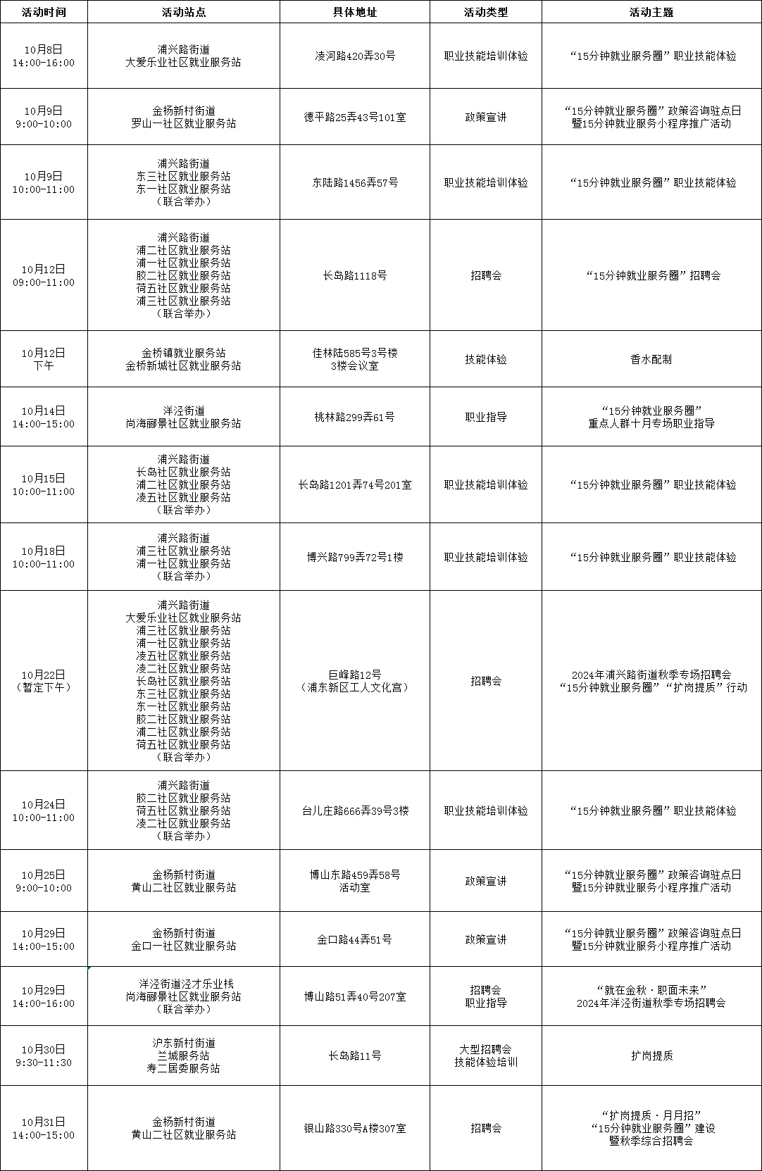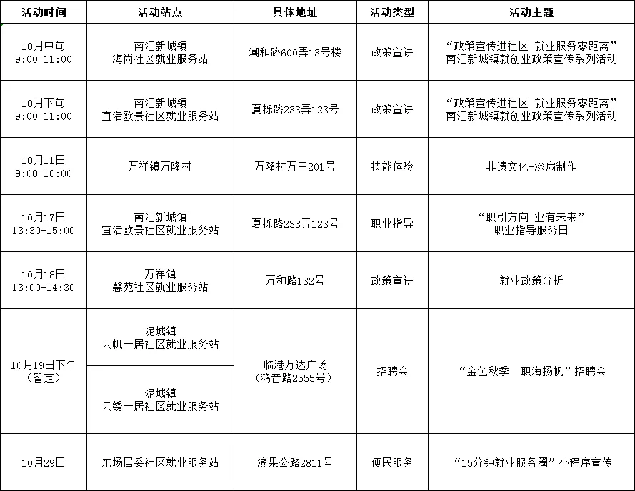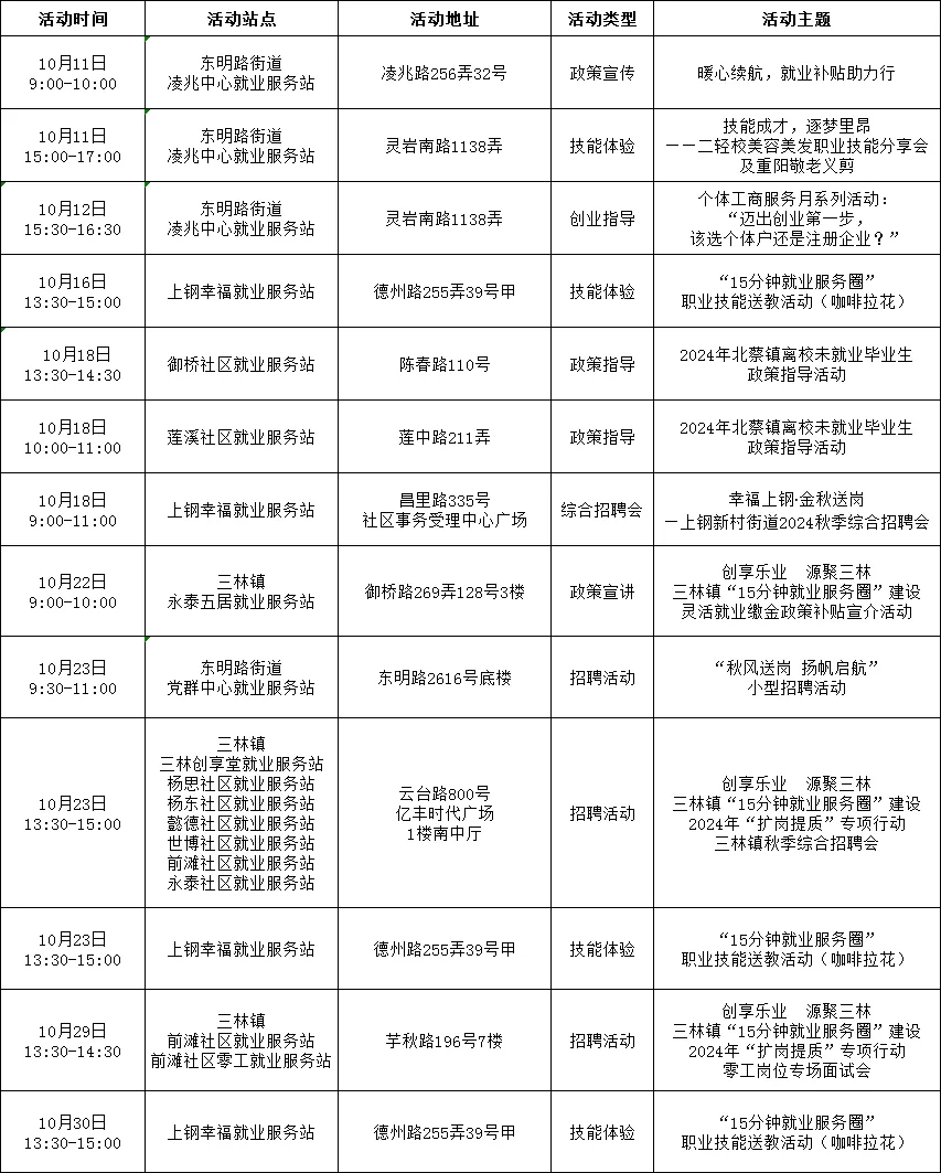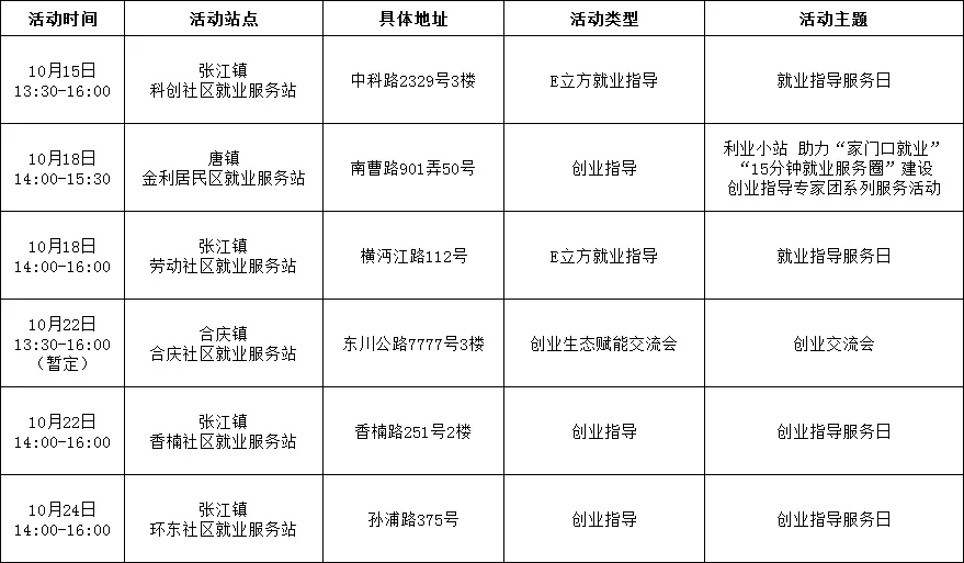 “15分钟就业服务圈”社区就业服务站点建设市政府实事项目作为人社部门常态化政府开放活动之一,我们将持续发布精彩服务内容,今天为大家带来徐汇、嘉定、浦东新区、崇明区、宝山区、金山区5区近期就业活动安排!