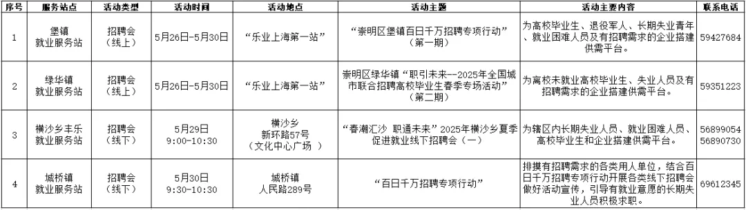 “15分钟就业服务圈”社区就业服务站点建设市政府实事项目作为人社部门常态化政府开放活动之一,我们将持续发布精彩服务内容,今天为大家带来黄浦区、长宁区、奉贤区、崇明区、静安区、杨浦区、闵行区、青浦区近期就业活动安排!