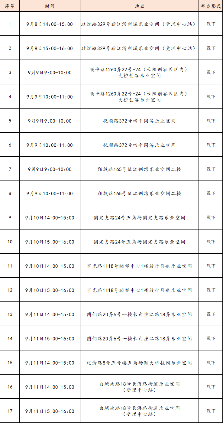 “15分钟就业服务圈”社区就业服务站点建设市政府实事项目作为人社部门常态化政府开放活动之一,我们将持续发布精彩服务内容,今天为大家带来黄浦区、长宁区、静安区、杨浦区、闵行区、崇明区、金山区、松江区、青浦区近期就业活动安排!