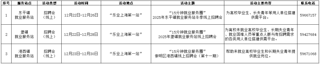 “15分钟就业服务圈”社区就业服务站点建设市政府实事项目作为人社部门常态化政府开放活动之一,我们将持续发布精彩服务内容,今天为大家带来黄浦区、长宁区、松江区、青浦区、崇明区、杨浦区、闵行区近期就业活动安排!