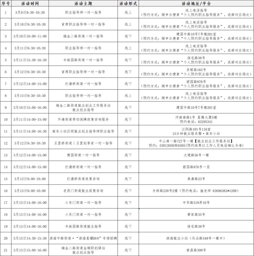 “15分钟就业服务圈”社区就业服务站点建设市政府实事项目作为人社部门常态化政府开放活动之一,我们将持续发布精彩服务内容,今天为大家带来闵行区、金山区、松江区、青浦区、黄浦区、长宁区、普陀区、静安区、杨浦区、崇明区近期就业活动安排!