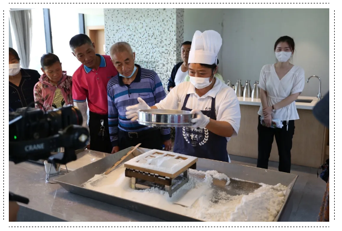 “米食餐厅”大堂一侧,一间古色古香的“叶榭软糕”制作室引起了市民代表的注目。新鲜碾好的松江大米,淘洗、浸泡,再晾晒、细筛,最后筛入蒸烙,辅以精细绵白糖和各色馅心,上海市非物质文化遗产“叶榭软糕”新鲜出炉了。在这里,不仅可以品尝到悠久的历史味道,还可以体验参与,一边听阿姨讲解叶榭软糕的故事,一边学习软糕的制作方式,用浸入式体验的方式,将非遗传承。