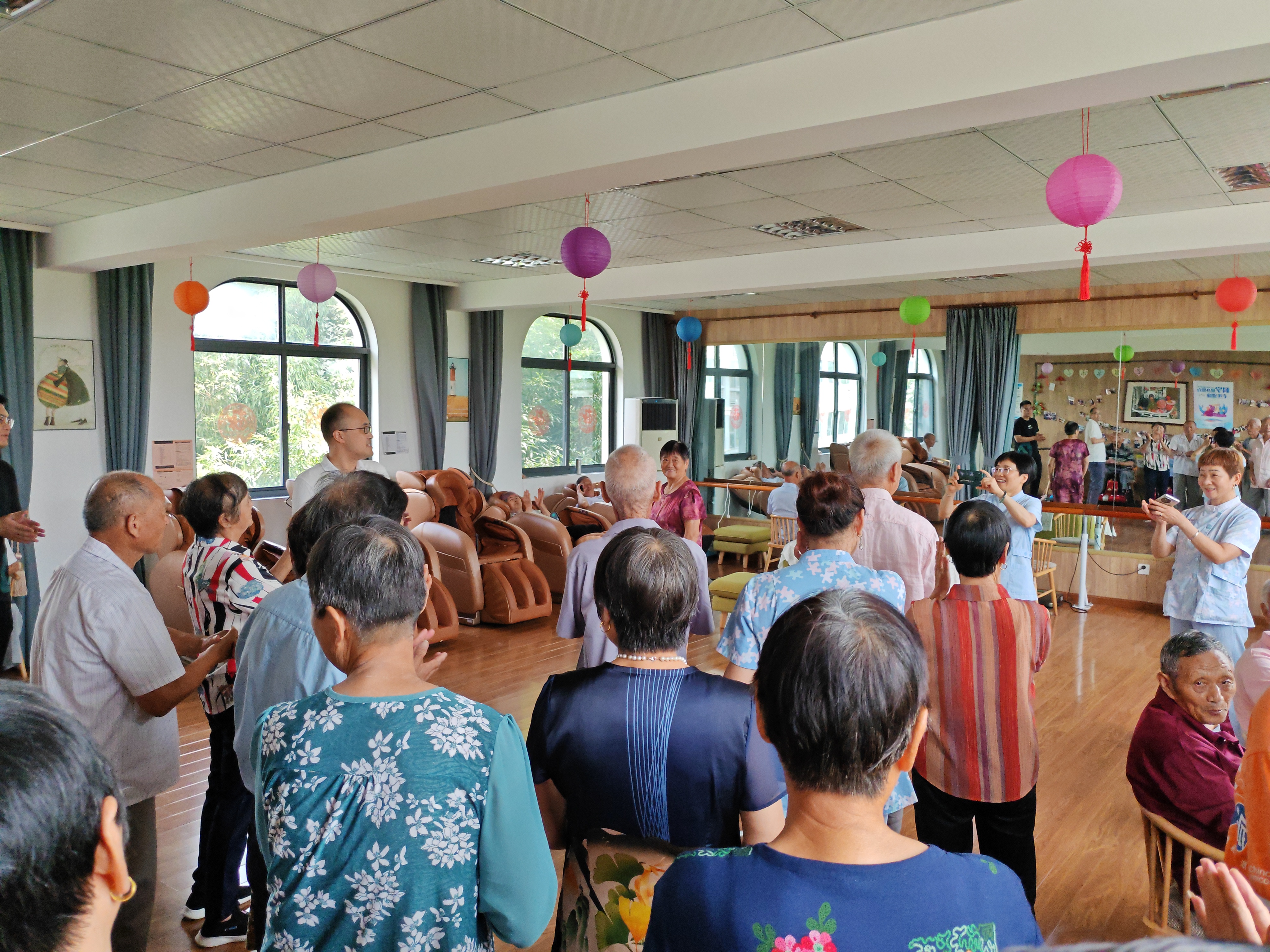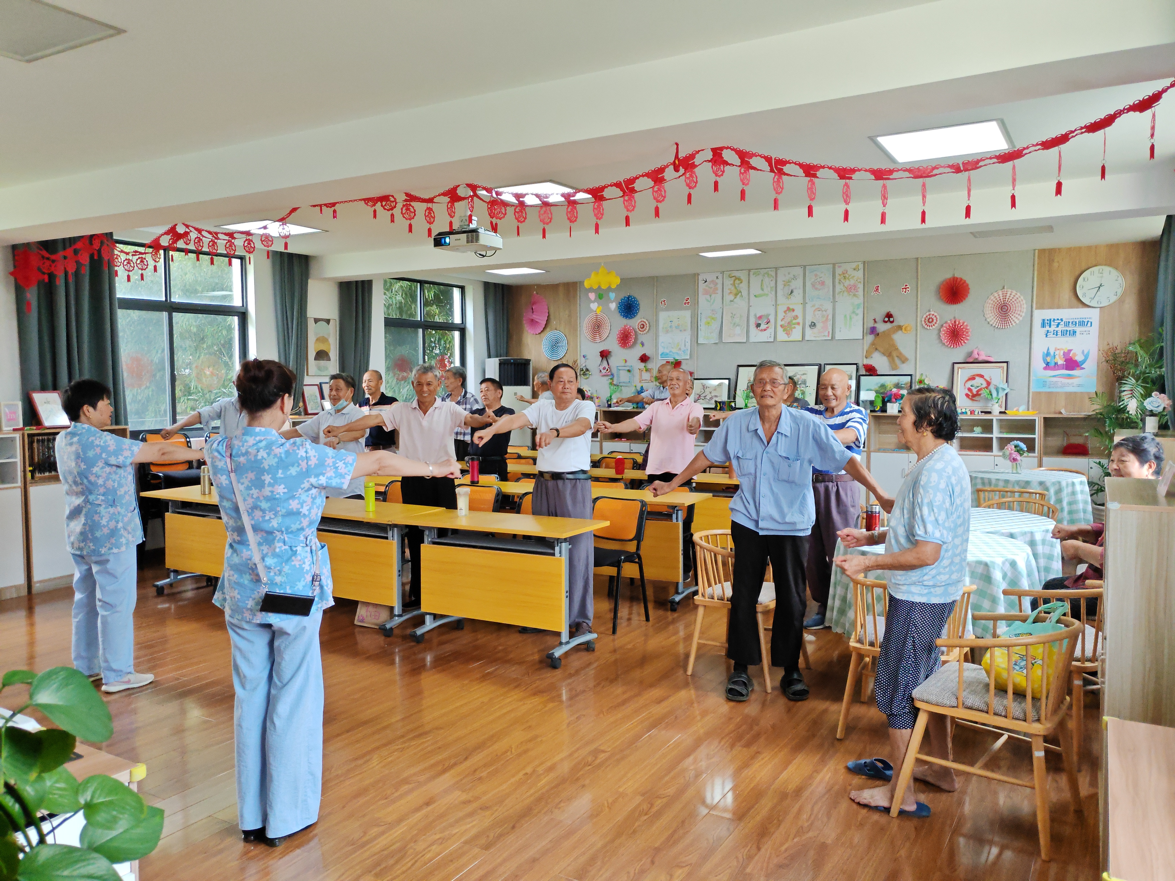 上午8:30时,正式活动尚未开始,一楼二楼的老年会员及群众代表就已开始了养生操活动。