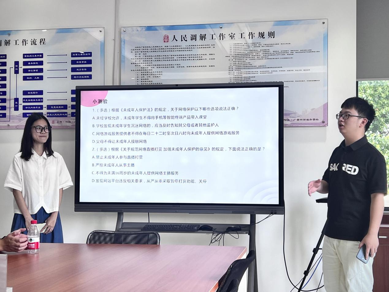 为进一步体现公共法律服务的公益属性,引导居民群众沉浸式体验法治魅力,“讲解员”为大家呈现了一堂生动有趣又不失教育意义的普法讲座。讲座以一问一答的模式开展,将《未成年人保护法》作为此次普法的重点,选取群众日常生活中较为典型和容易忽视的例子进行讲解。一位阿姨在活动中发出提问:“儿子近来迷上了网络直播,还偷偷挪用父母的钱来给网络主播打赏,这些钱还能要回来吗?”针对阿姨的问题,“讲解员”解释道,未成年人网络打赏不具有法律效力,父母可以通过不予追认来追回打赏,解决了困扰阿姨已久的疑惑。案例讲解结束后,活动议程来到情景问答环节。工作人员选取了数道日常法律知识题目,与群众们积极互动,参与讲座的群众也十分踊跃,积极准确地回答出了问题。