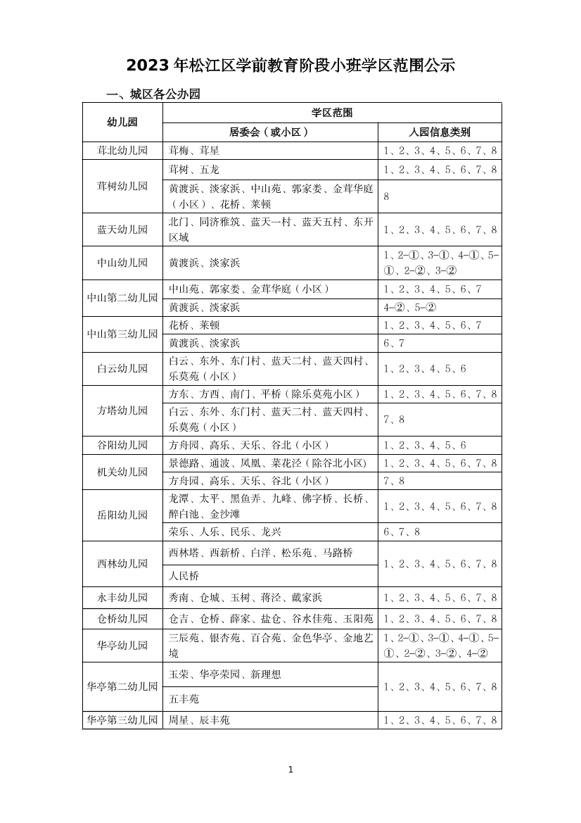 2023年松江区学前教育阶段小班学区范围公示