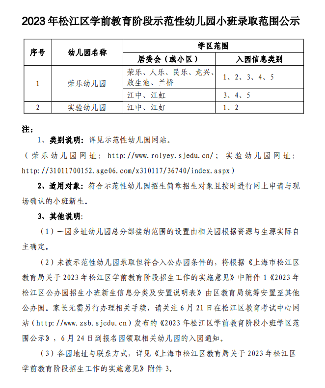 2023年松江区学前教育阶段示范园小班学区范围公示